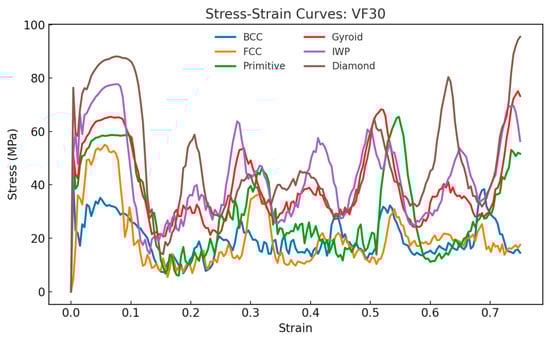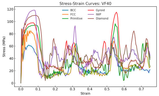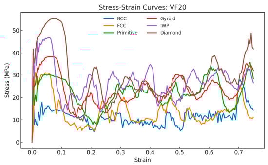 Figure 10, Figure 11 and Figure 12 show the compressive stress–strain curves for all lattice types at 20%, 30%, and 40% relative density, respectively. The characteristic oscillatory behavior is evident across all TPMS- and strut-based lattices, with multiple load drops corresponding to localized cell wall collapse followed by stress recovery. This oscillatory behavior is consistent with experimental studies on the compressive response of AlSi10Mg lattices [37,38]. Diamond exhibited the highest peak stress and most pronounced recovery, suggesting a superior resistance to localized fracture.