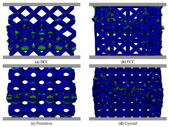 The observed failure modes and fracture mechanisms are consistent with experimental studies of metal-based lattices [39,40], where TPMS lattices demonstrated improved damage tolerance compared to strut-based structures. The continuous curvature of TPMS promotes a more homogeneous stress distribution, thereby avoiding early localization and collapse. In particular, the Diamond topology’s X-shaped failure bands confirm its ability to dissipate energy through distributed damage, supporting its superior performance in both volumetric and specific energy absorption.