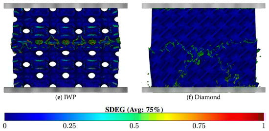 To better understand the failure mechanisms and to locate the fracture zones, the stiffness degradation (SDEG) is visualized. At damage initiation, the value of SDEG is equal to 0. As the material undergoes softening and then fracture, stiffness degradation increases to 1. Mapping the SDEG provides insights into the evolution of local stiffness loss and fracture zones. Figure 13 shows the distribution of SDEG at a global strain of 0.2 for each lattice type at 30% relative density.