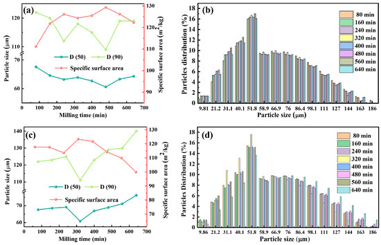 The particle size and distribution of the raw material powders are key factors influencing the sintering process. Finer particles exhibit larger specific surface areas and higher surface energy, which enhances the thermodynamic driving force and promotes atomic or ionic diffusion through increased contact area and reduced diffusion paths. Laser particle size analysis was performed on powder mixtures subjected to various ball milling times. As illustrated in Figure 2, both P1 and P2 samples exhibited a trend of particle size decreasing followed by an increase with extended ball milling time. For P1, the median particle sizes D (50) and D (90) reached minima of 60.9 μm and 109 μm at 480 min, corresponding to a maximum specific surface area of 129.3 m2/kg. Similarly, P2 reached D (50) and D (90) minima of 60.8 μm and 111 μm at 320 min, with a surface area peak at 123.3 m2/kg.