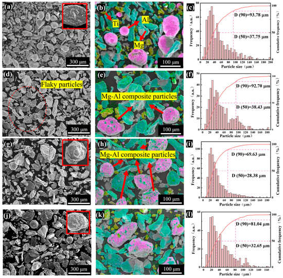 Both sample groups exhibited comparable trends. In the initial ball milling stage (80 min), the samples primarily consisted of discrete Mg, Al, and Ti particles. Most of these particles retained their original morphology, showing no significant deformation. However, some fine particles were observed adhering to the larger Mg and Al particles (As shown in the inset at the top right of Figure 3a). As milling progressed, brittle Ti particles fragmented into irregular shapes, while ductile Mg and Al particles underwent plastic deformation. Additionally, some Mg particles transitioned from lath-like to flake-like morphologies, with fatigue cracks forming due to accumulated internal stresses (highlighted in Figure S1d). During this period, the dominant mechanism is the plastic deformation mechanism, and the proportion of crushing events is relatively low. Microscopically, cold welding and stress accumulation at particle interfaces became increasingly pronounced. The Mg particles are mainly present as flakes when the ball milling time increases to 240 min (Figure 3d), at which point magnesium-aluminum composite particles begin to appear (Figure 3e) and further increase at 320 min due to enhanced diffusion between magnesium-aluminum particles (Figure 3h). At the same time, the magnesium particles transformed into flakes readily adhere to the surface of aluminum particles, thereby promoting diffusion (As shown in the inset at the top right of Figure 3g,j). Moreover, more energy accumulated by collisions at 320 min leads to stress concentration inside the ductile particles and thus particles fracture, so the number of small-sized particles increases substantially (Figure 3i). Column distribution (Figure 3c,f,i,) analysis confirmed a gradual shift toward smaller particle sizes, with D (50) minima observed at 320 min for P2 and 480 min for P1, consistent with laser particle size measurements. In addition, it is shown that throughout the ball milling process, aluminum is always dominated by the plastic deformation mechanism, and its particle morphology gradually evolves from the initial near-spherical shape to a fibrous ductile structure.