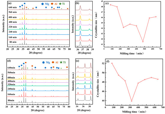 To further determine whether alloying occurred during the ball milling process, we analyzed the powders at different milling durations using XRD. The results are shown in Figure 4. Diffraction peaks derived from Mg, Al, and Ti can be identified, while no large amounts of other phases were found for all the milling times. Quantitative analysis confirmed that the ratio of the three was basically the same as that of the addition, indicating that the ball milling process was mainly dominated by physical mixing, and no alloying reaction or other chemical reactions occurred. Notably, compared to P1, P2 exhibits a higher aluminum content, resulting in the increase in peak intensity for aluminum in the P2 sample spectrum (Figure 4a,d).