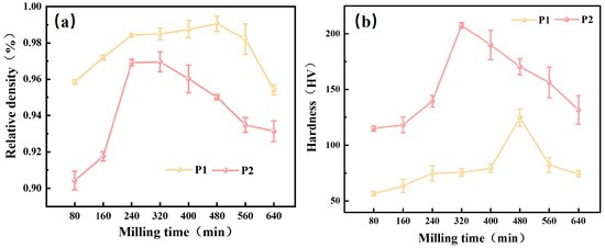 We conducted experiments on two groups of samples, P1 and P2, with milling durations ranging from 80 to 640 min. Based on the relative density and hardness measurements of the resulting samples, a comprehensive evaluation indicated that the P2 group exhibited superior performance. Therefore, the P2 samples were selected for further investigation to determine the optimal sintering temperature.