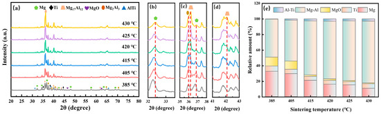 The sintered samples at different temperatures primarily consist of Mg, Ti, oxides, Mg-Al intermetallic compounds (Mg17Al12, Mg2Al3), and Al-Ti intermetallic compounds (AlTi, Al3Ti, AlTi3). The samples sintered at 385 °C showed insufficient sintering characteristics, and the composition was mainly composed of Mg, Ti, MgO, and Mg-Al intermetallic compounds (Mg17Al12, Mg2Al3) produced during the sintering process. As the sintering temperature increases, the diffraction peak intensities of Mg and MgO gradually decrease, whereas those of Mg-Al intermetallic compounds show a progressive increase (Figure 9c,d). Notably, a slight shift in the Mg diffraction peaks toward higher angles is observed (Figure 9b,c), indicating the solid solution of a small amount of Al in the Mg lattice. This peak shift results from lattice contraction due to substitutional incorporation of smaller Al atoms (atomic radius: 1.43 Å) into the hcp Mg structure (atomic radius: 1.60 Å). Concurrently, the relative content of Mg and MgO decreases stepwise with rising sintering temperature, while the fraction of Mg-Al intermetallic compounds increases, eventually reaching approximately 80% of the total phase composition. Microstructural analysis further reveals that elevated temperatures promote particle deformation and disrupt oxide layers. This reduction in porosity enables effective metallurgical bonding between particles, ultimately enhancing the alloy’s strength. However, we found remelting overflow on the surface of the alloy at 465 °C, which will cause its performance to be reduced. Additionally, Ti-Al intermetallic compounds (such as AlTi, Al3Ti, and AlTi3) begin to precipitate and gradually increase in content with rising sintering temperature. These observations collectively demonstrate the strong influence of sintering temperature on atomic diffusion kinetics. Enhanced diffusion at elevated temperatures facilitates the co-precipitation of multiple intermetallic compounds, significantly impacting the microstructural evolution and final properties of the alloy.