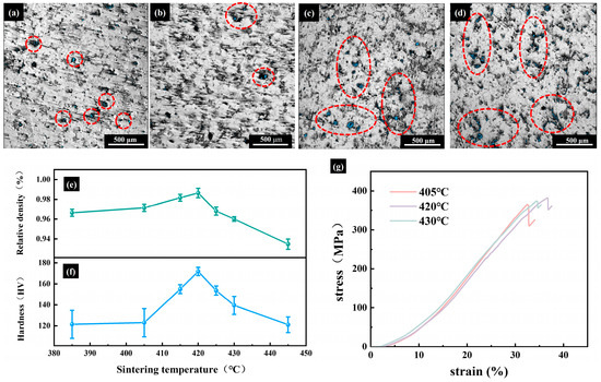 Samples at different sintering temperatures for 320 min. (a–d) Optical images: (a) 415 °C, (b) 420 °C, (c) 425 °C, (d) 430 °C; (e) Room-temperature Relative density; (f) Room-temperature hardness; (g) Room-temperature Compressive stress–strain curves.