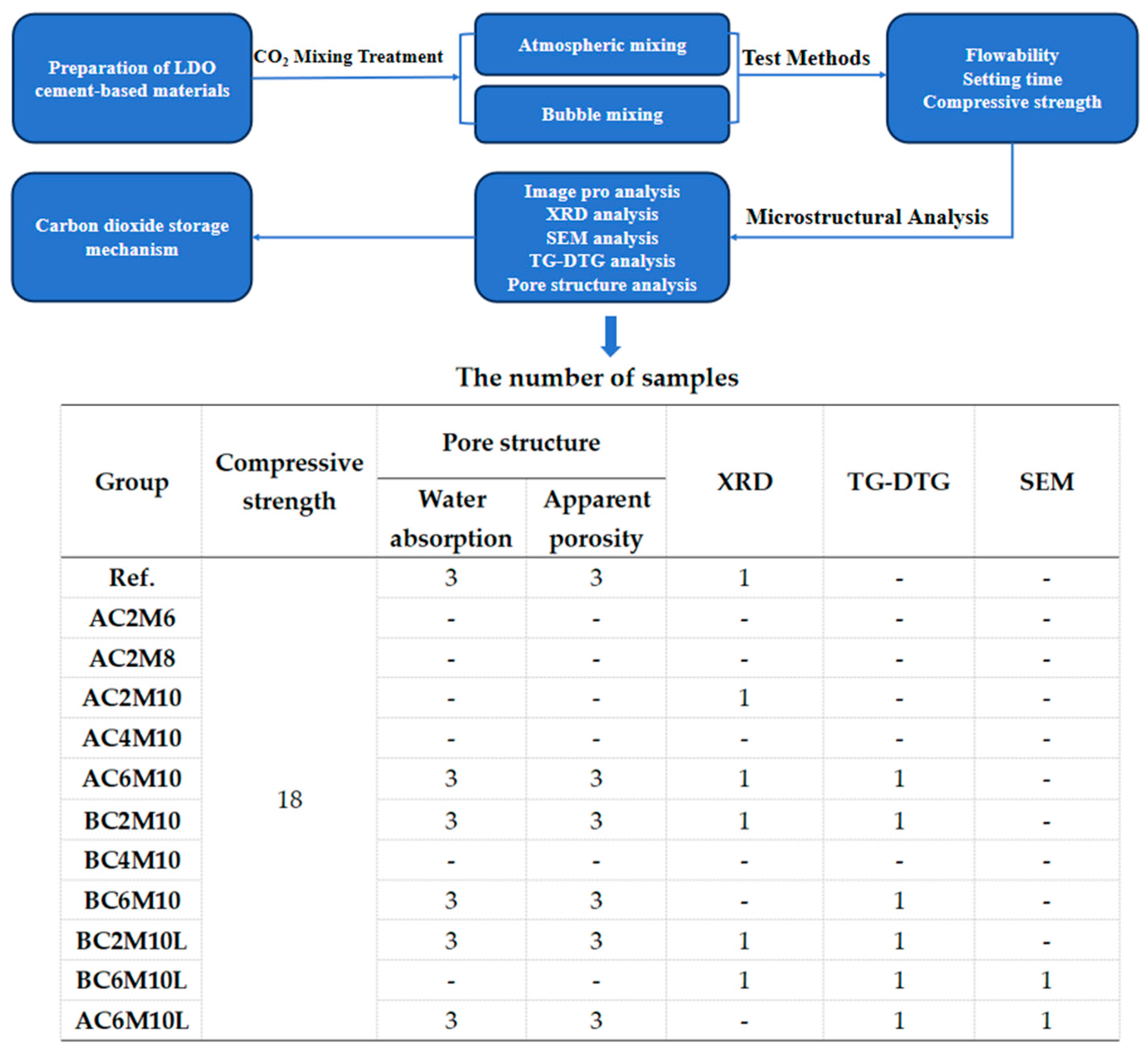 The application of LDO specifically for in situ carbonation in cement has not yet been systematically investigated, making this a novel and valuable area of study. This study systematically investigates the synergistic effects of key carbonation mixing parameters, including mixing time, CO2 injection duration, and mixing methods in combination with LDO on the properties of cement paste. By evaluating their combined impact on mechanical properties, microstructure, and most critically, CO2 storage capacity, this study aims to provide a novel and practical strategy for improving carbonation mixing technology in cement-based materials.