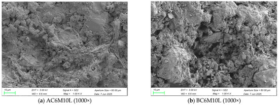 Figure 12 presents SEM images of cement pastes prepared using atmospheric mixing and bubble mixing methods, both incorporating LDO. Figure 12a,b compare the morphologies of samples prepared by atmospheric and bubble mixing, respectively, at 1000× magnification under identical conditions. It can be observed that the paste produced by bubble mixing exhibits significantly higher porosity, whereas the atmospheric mixing sample displays a denser microstructure. This contrast becomes more evident at higher magnifications. Figure 12c shows the AC6M10L sample at 5000× magnification [25]. Characteristic hydration products such as C-S-H and portlandite are identifiable by their typical fibrous texture and hexagonal plate morphology, respectively. Additionally, LDH phases can be observed as crystalline structures with rounded plate-like edges. In the BC6M10L sample, at 5000× magnification in Figure 12d, a clearly visible pore structure with a honeycomb-like (faveolate) distribution is evident, suggesting that bubble mixing promotes the formation of fine capillary pores. This microstructural feature helps explain the lower compressive strength observed in the bubble-mixed samples compared to those mixed atmospherically.