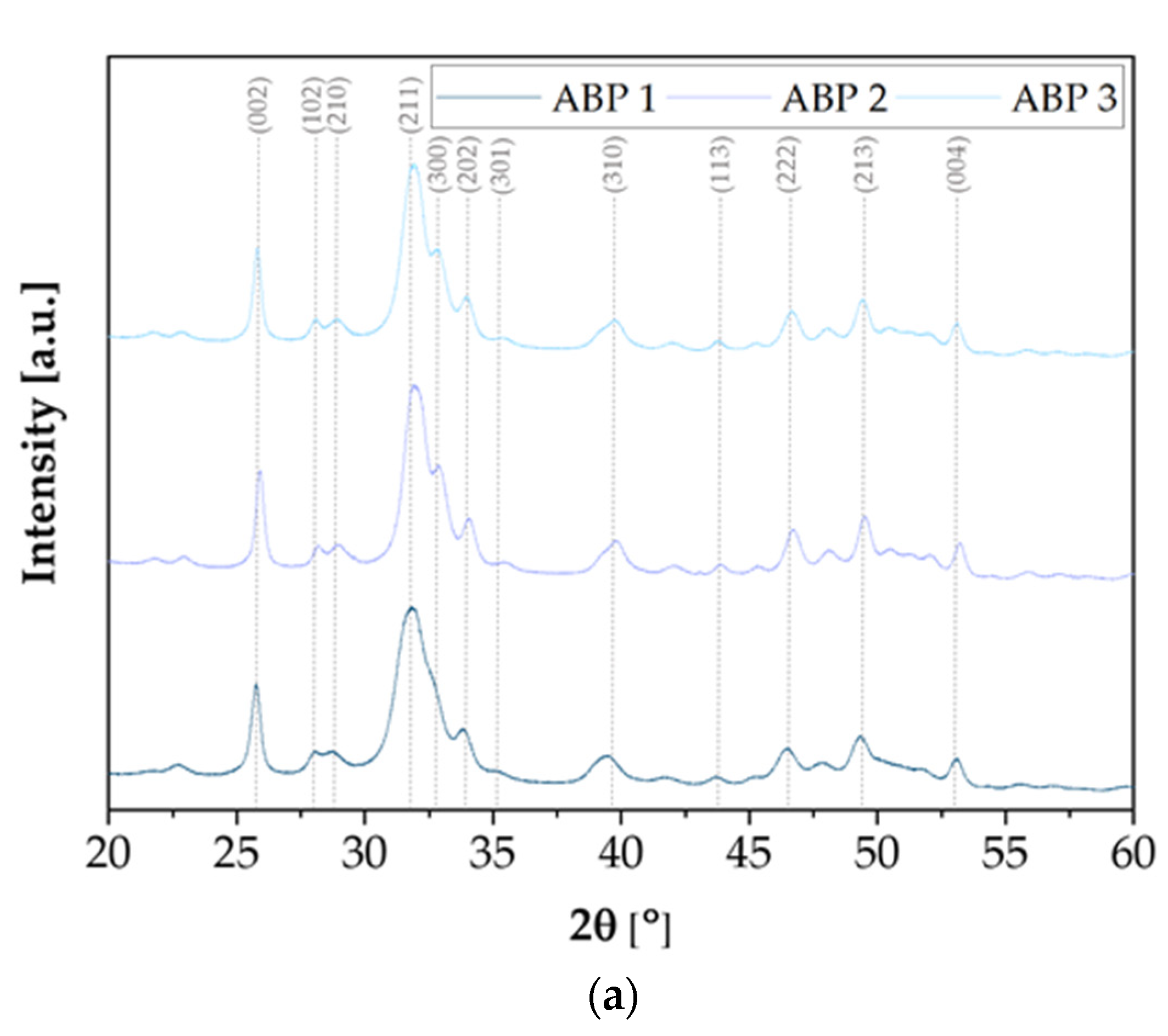 Figure 2 present the results of the X-ray analysis of ceramic powders obtained using three different methods: ABP, ACP, and ANP. In all cases, characteristic diffraction peaks are visible, confirming the presence of a crystalline phase corresponding to hydroxyapatite with a hexagonal structure (ICDD 01-080-7085, spatial arrangement P6