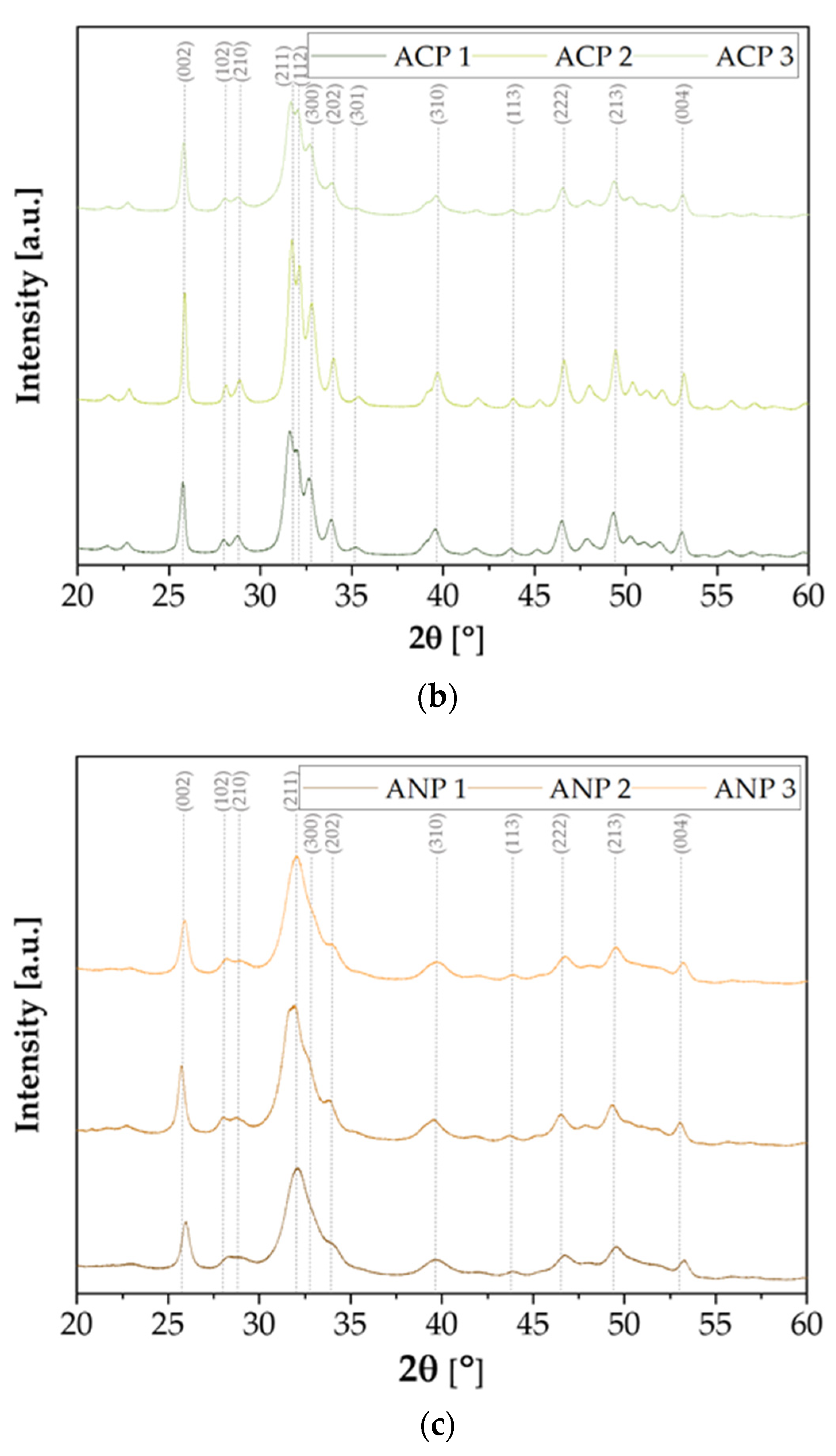 In the case of the acid–base precipitation (ABP) method, a gradual increase in the Ca/P ratio was observed with increasing pH, from 1.43 for pH = 6 (ABP 1), through 1.55 for pH = 7 (ABP 2), to 1.76 for pH = 11 (ABP 3). A similar relationship was observed for the ammonium nitrate (ANP) method, where the Ca/P ratio increased from 1.32 for ANP 1 to 1.88 for ANP 3. The acetate method (ACP) showed slightly less sensitivity to pH but also revealed an increase in the Ca/P ratio from 1.42 to 1.72. Ca/P values close to 1.67 were obtained for samples ABP 2 (1.55), ANP 2 (1.63), and ACP 2 (1.60), which indicates the possibility of obtaining materials with a composition close to stoichiometric hydroxyapatite with the appropriate selection of parameters. In contrast, samples ABP 3 (1.76), ANP 3 (1.88), and ACP 3 (1.72) showed a Ca/P ratio higher than 1.67, which may indicate the presence of calcium-rich phases or an excess of Ca(OH)2 remaining after synthesis. Such excess calcium, although potentially increasing the bioactivity of the material (due to the possibility of faster release of Ca2+ ions), may also affect its phase stability and solubility in vivo.