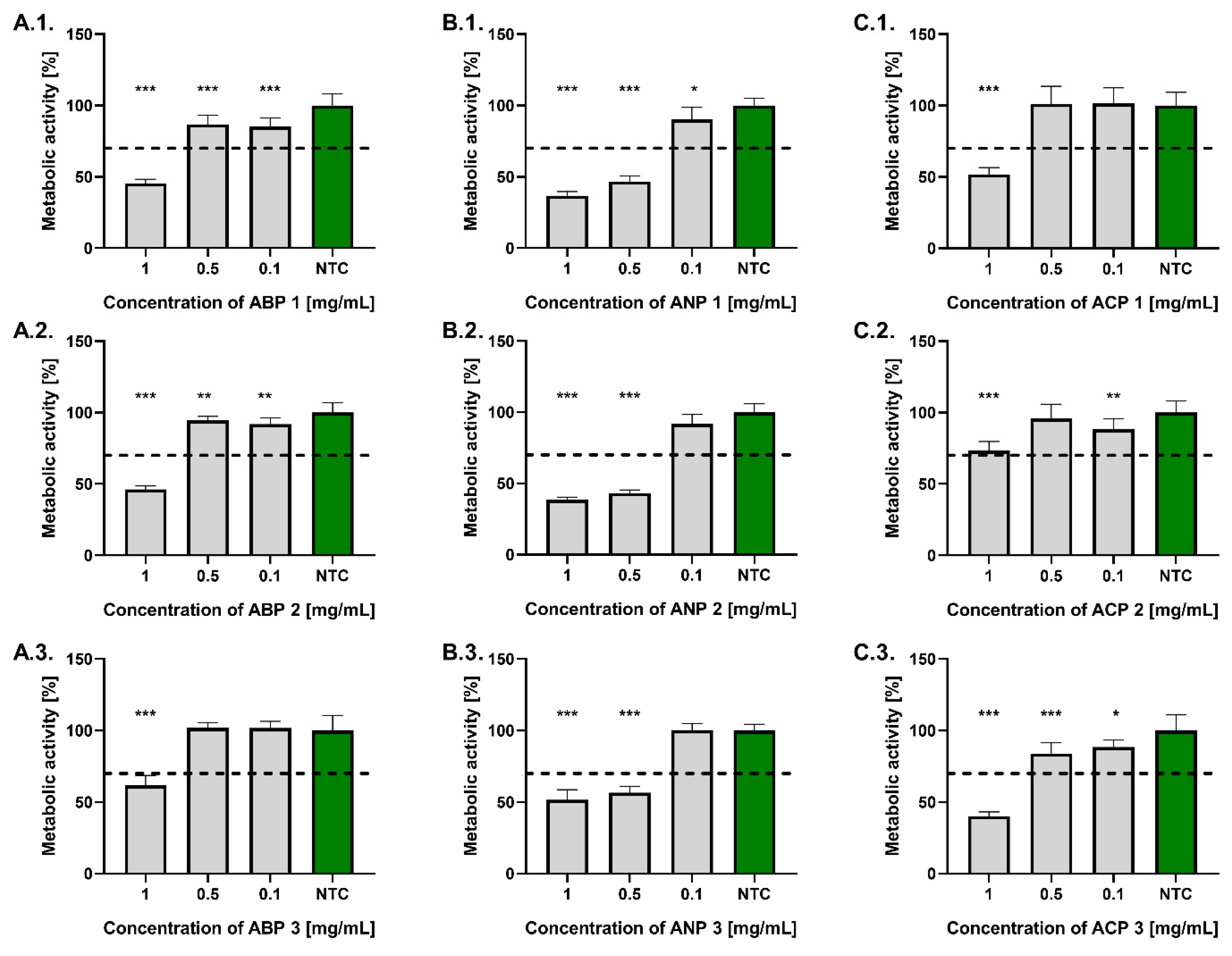 Figure 5, all tested powders at a concentration of 0.1 mg/mL complied with the ISO 10993-5:2009 standard, maintaining L929 fibroblast metabolic activity above 70% relative to untreated controls. At a concentration of 0.5 mg/mL, significant differences in fibroblast viability were observed among the tested powders. Compliance with the ISO standard was demonstrated by ABP 1, ABP 2, ANP 2, ACP 1, and ACP 2. The highest metabolic activity at a concentration of 0.5 mg/mL was observed in fibroblasts treated with ABP 3 (97.5 ± 6.3%), whereas the lowest was recorded for those exposed to ANP 1 (65.5 ± 3.3%). At a concentration of 1 mg/mL, only ACP 1, ACP 2, and ABP 3 met the requirements of the ISO standard. The highest metabolic activity was found in cells treated with ABP 1 (79.5 ± 8.0%), whereas the lowest was recorded following exposure to ANP 1 (48.7 ± 7.2%).