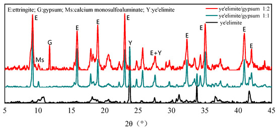 XRD patterns of different mixing proportions: (a) (G-0); (b) /gypsum 1:1 (G-1); (c) /gypsum 1:2 (G-2).