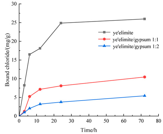 Figure 3 presents the chloride binding capacity of specimens with different mixing proportions. The chloride binding capacity of all three specimen groups increases with prolonged immersion. The specimen without gypsum (G-0) exhibits the highest binding capacity, whereas the specimen with the highest gypsum content (G-2) shows the lowest. This difference is attributed to the fact that the hydration products of pure primarily comprise AFm and AH3. Chloride ions can undergo ion exchange with SO42− in AFm to generate Friedel’s salt, and extended immersion facilitates more complete Cl− binding by AFm [27]. Notably, Cl− binding increases rapidly within the initial 10 h of immersion, followed by a gradual slowdown until reaching equilibrium. This is because the powder sample used for immersion has a larger contact area with the immersion liquid, which accelerates the binding of chloride ions by the hydration product. With increasing gypsum dosage, the AFm content in the hydration products decreases. At the highest gypsum level, AFt and AH3 become the primary hydration products, and AFt exhibits negligible chloride binding capacity; in this case, the limited binding is likely due to physical adsorption by AH3.