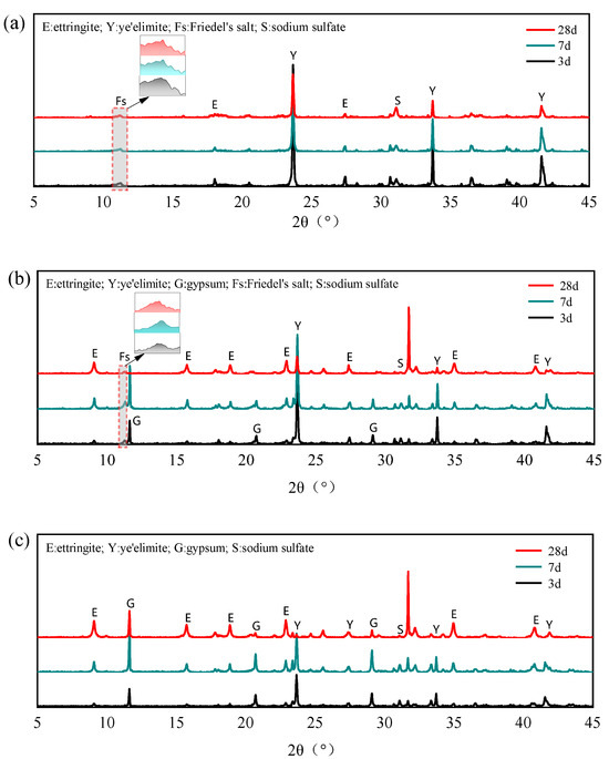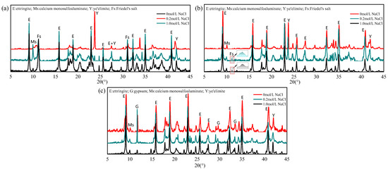XRD patterns of different mixing proportions with 0.4 mol Cl−: (a) ; (b) /gypsum 1:1; (c) /gypsum 1:2.