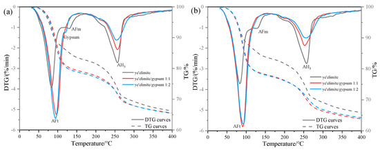 Comparative analysis of TG results under varying Cl− concentrations reveals contrasting behaviors. In gypsum-free systems, the increase in Cl− content was associated with AFm depletion and enhanced Friedel’s salt formation, demonstrating a dominant role of AFm in chemical chloride binding. By contrast, gypsum-containing systems exhibited stable AFt content regardless of Cl− concentration, since the presence of sulfate ions (SO42−) causes hydration to mainly form the Aft rather than the AFm phase. The high crystallinity and needle-like morphology of AFt densify the hardened paste matrix, effectively inhibiting Cl− ingress, and the chemical binding of Cl− is achieved by the ion exchange between Cl− and SO42− in the interlayer of AFm. In addition, when the concentration of SO42− in the system is too high (in the case of the /SO42− ratio being 1:2), it may prevent the SO42− in the interlayer of AFm from being displaced, which in turn impairs the chloride ion binding capacity of the system. As a result, the chloride binding capacity of gypsum-modified systems showed only a modest increase with rising solution concentration, explaining the relatively gentle upward trend in binding efficiency observed with gypsum incorporation.