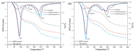 The hydration process of is strongly dependent on gypsum content. In the absence of gypsum, primarily hydrates to form the AFm phase, accompanied by the generation of aluminum hydroxide gel (AH3). In contrast, abundant gypsum promotes ettringite (AFt) formation alongside AH3, as illustrated in Equations (1) and (2) [25]. Consequently, the -to-gypsum ratio governs the relative proportions of these hydration products, ultimately determining the chloride binding capacity.