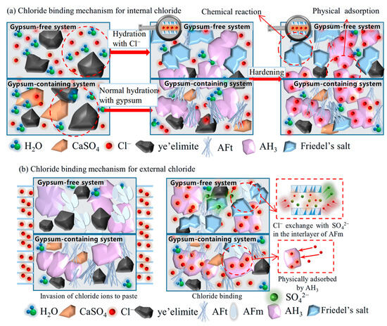 Based on the chloride binding results obtained from experiments, the chloride binding mechanism of for internal and external chlorides is illustrated in Figure 10. Internal chloride ions are directly added into the mixing water; in a gypsum-free system, the internally incorporated Cl− participates in the hydration of , directly generating Friedel’s salt and AH3, thereby being chemically bound. The formed AH3 will further physically adsorb the residual free Cl−. While in a gypsum-containing system, will react preferentially with gypsum to form AFt, which has almost no binding ability; only a small proportion of Cl− also reacts with to form Friedel’s salt. In addition, Cl− can still be physically adsorbed by generated AH3. External chloride ions penetrate from immersion solution to hydrated pastes. The main compositions for the gypsum-free system are AFm, AH3, and unhydrated , Cl−, which will exchange SO42− in the interlayer of AFm to form Friedel’s salt and are chemically bound through interaction with AFm. In a gypsum-containing system, a limited amount of AFm is generated, and the high concentration of SO42− inhibits chloride-sulfate ion exchange in AFm phases. Similar to the internal incorporation condition, penetrated Cl− can also be adsorbed by the AH3 gels for physical binding.