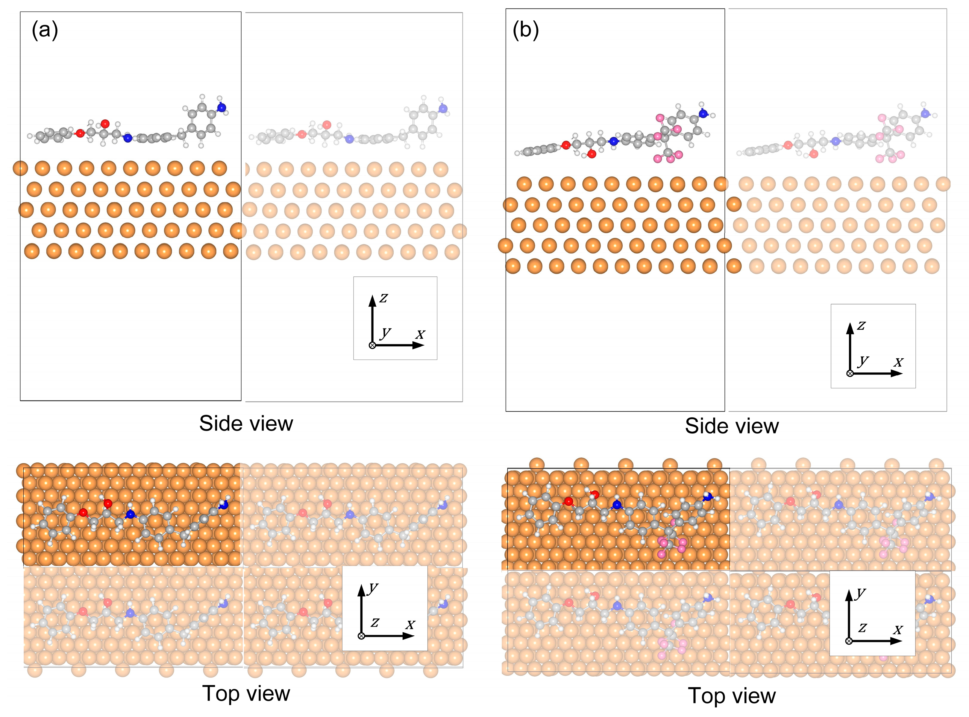 ρ are greater for the Cu/DDM-EP interface compared to the Cu/6FDAM-EP interface. This is because the DDM-EP molecule is closer to the Cu(111) surface than the 6FDAM-EP molecule. Additionally, the two benzene rings of the DDM-EP molecule are oriented parallel to the Cu(111) surface, and the interaction between the π-bonds within the benzene rings and the Cu atoms facilitates the charge transfer. Meanwhile, the simulation calculations presented in