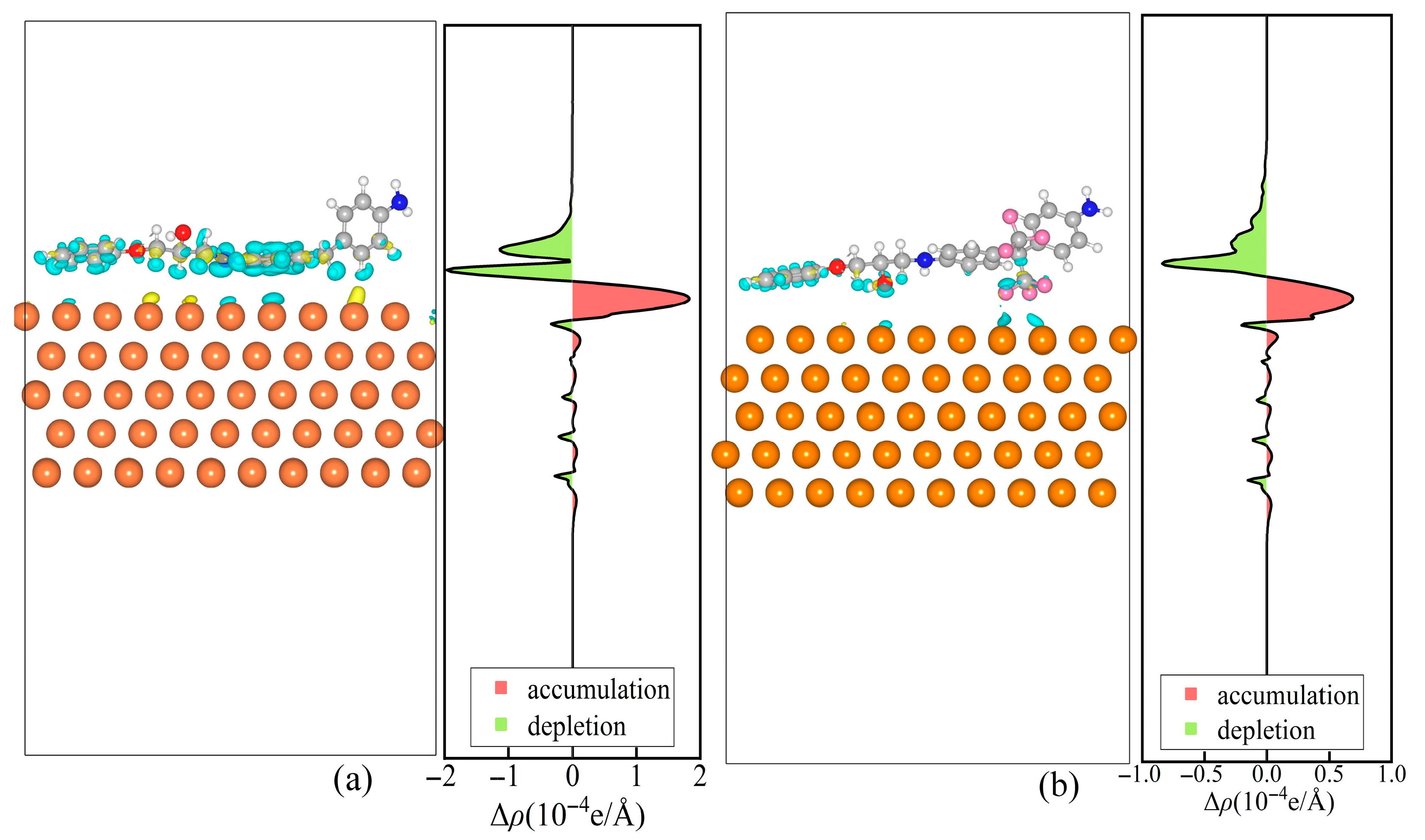 Table 1 reveal that both the electron injection barrier and the hole injection barrier of the Cu/6FDAM-EP model exceed those in the Cu/DDM-EP model. The injection barrier represents the energy that the charge within the epoxide small molecule must overcome to reach the metal surface, and this is manifested in the electron density difference curves. Specifically, both the positive and negative values of Δ