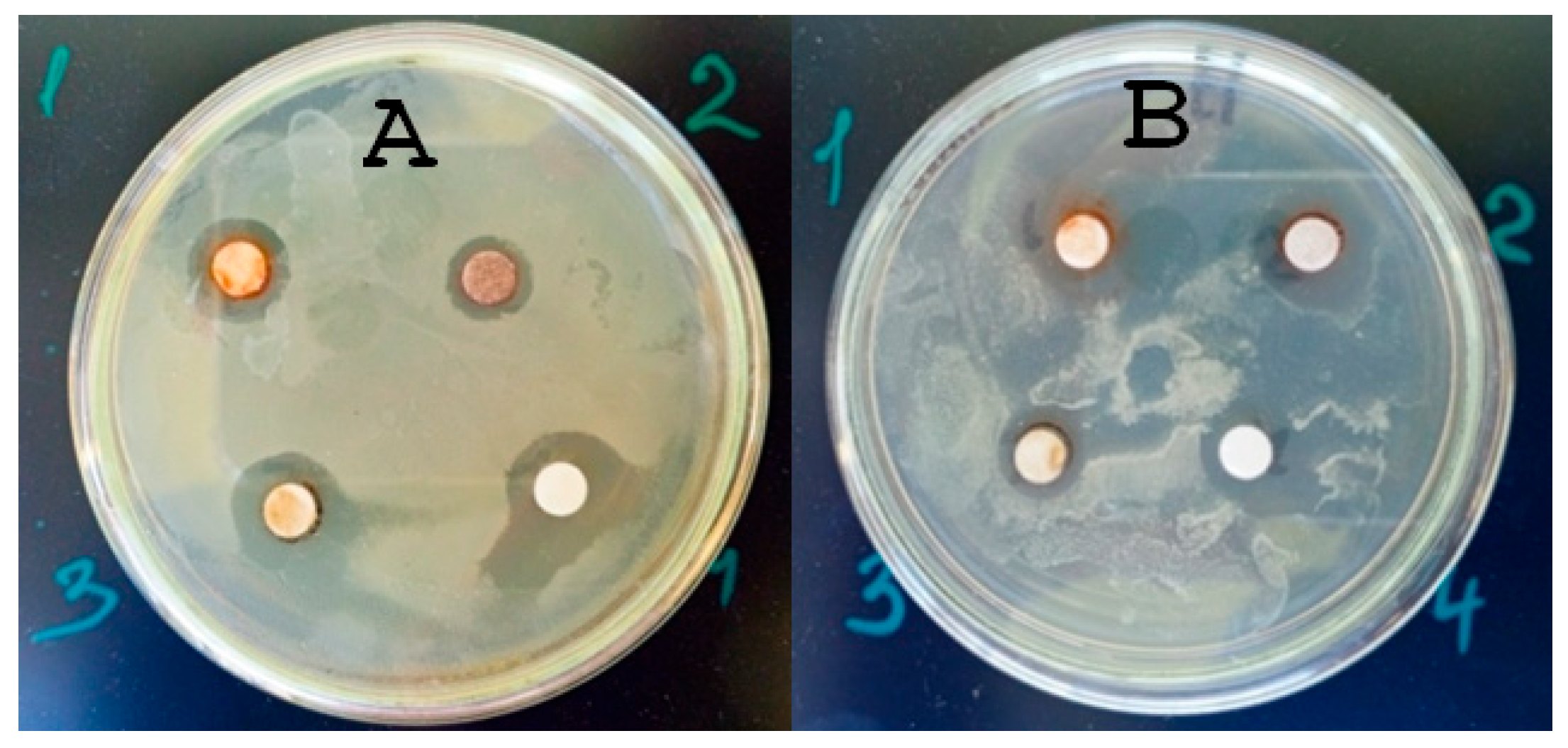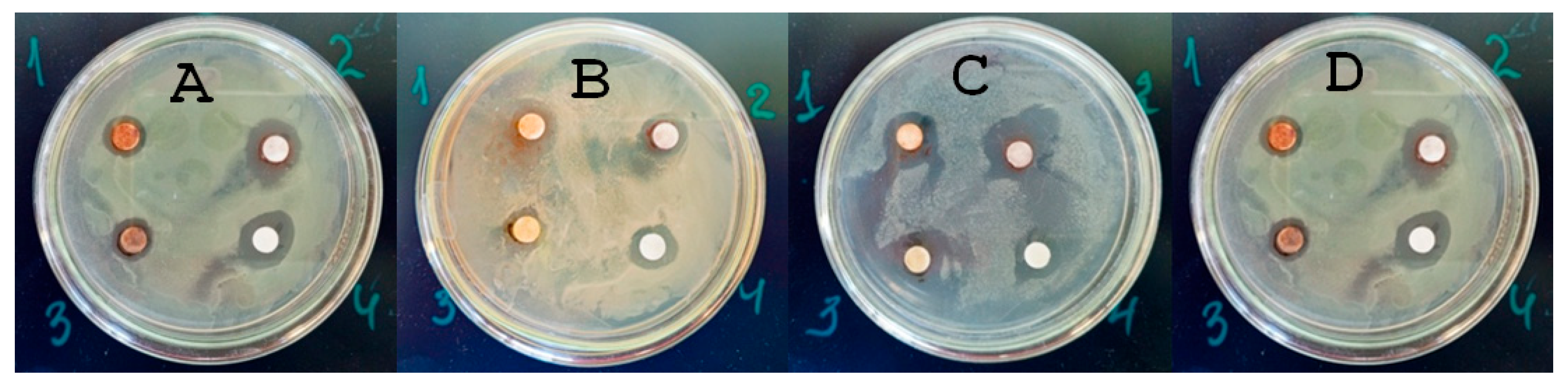 Bacterial cultures were grown in the liquid nutrient medium Luria Bertani broth (LB, Condalab, Torrejón de Ardoz, Spain) for 18–20 h at 37 °C. A standard inoculum corresponding to the 0.5 McFarland standard was used. A 100 µL bacterial suspension was spread over the surface of Mueller-Hinton agar plates using a sterile spreader. Sterile 6 mm diameter paper discs were placed on the agar surface with sterile tweezers, and 20 µL of the tested silver nanoparticle formulations were applied to each disc. Then the Petri dishes were incubated at 37 °C for 24 h. After incubation, the diameters of the inhibition zones were measured to the nearest millimeter, considering the area of complete bacterial growth suppression.