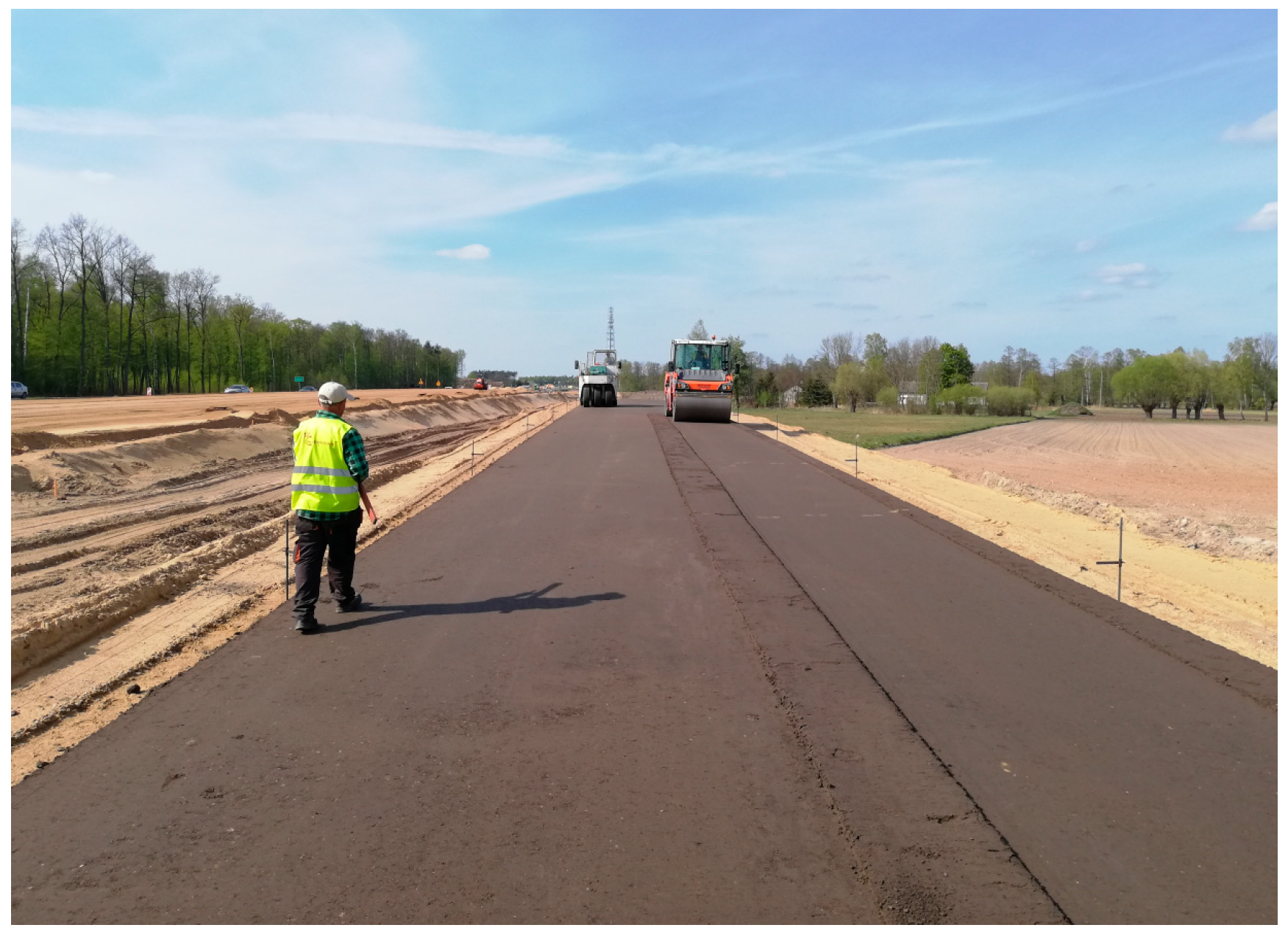 - The layer’s compaction control enabled determination of the number of passes of each type of a roller ensuring the achievement of the required compaction index. The above number was determined as four passes with a heavy steel wheeled roller in order to compact the deep subbase and four passes with a pneumatic tired roller in order to seal the surface of the layer.