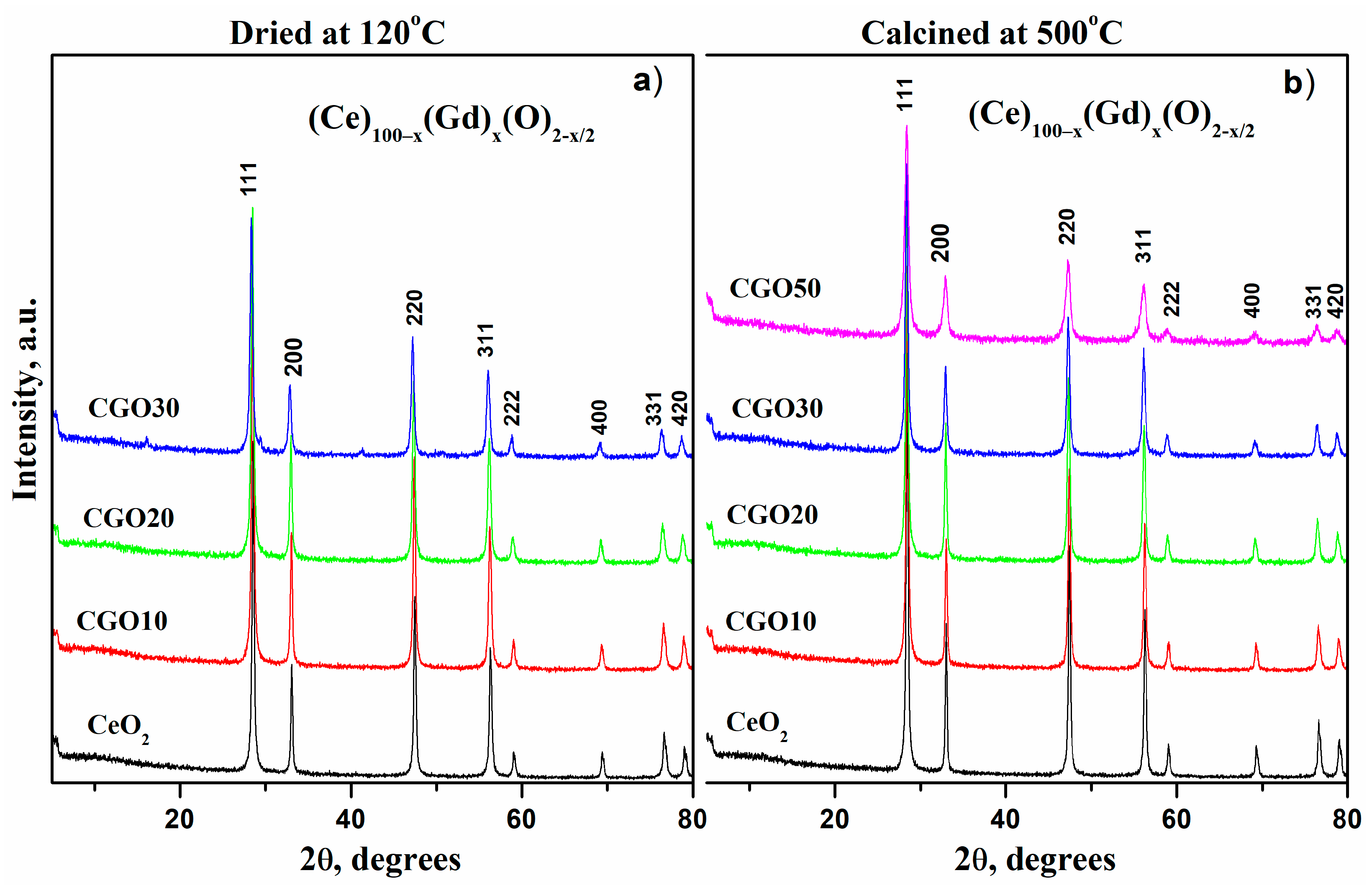 Figure 1. XRD patterns of (Ce)1−x(Gd)x(O)2−x/2 systems, dried at 120 °C (a) and calcined at 500 °C (b).