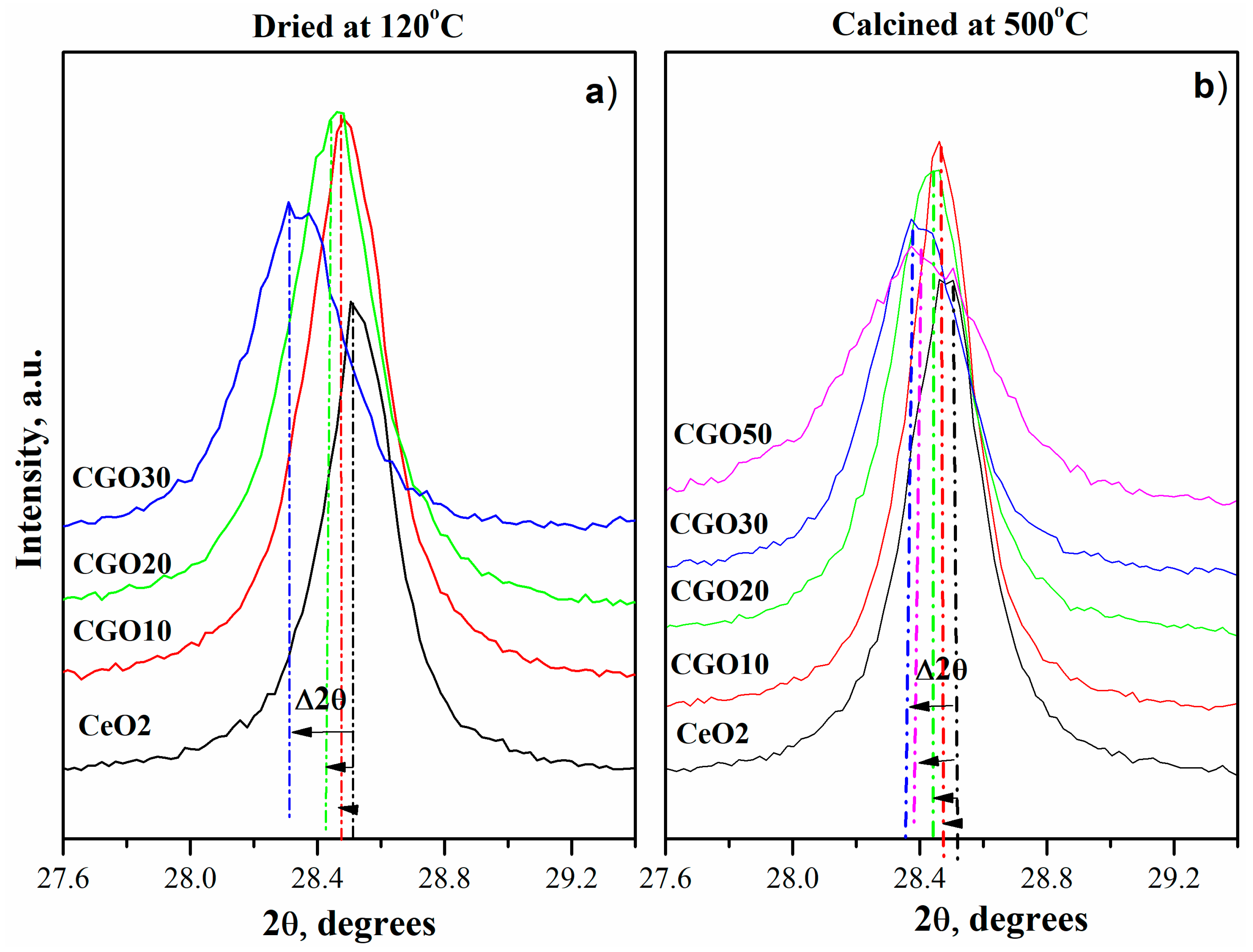 Figure 2. XRD patterns of (Ce)1−x(Gd)x(O)2−x/2 systems in the 2θ range around the (111) reflection, dried at 120 °C (a) and calcined at 500 °C (b).
