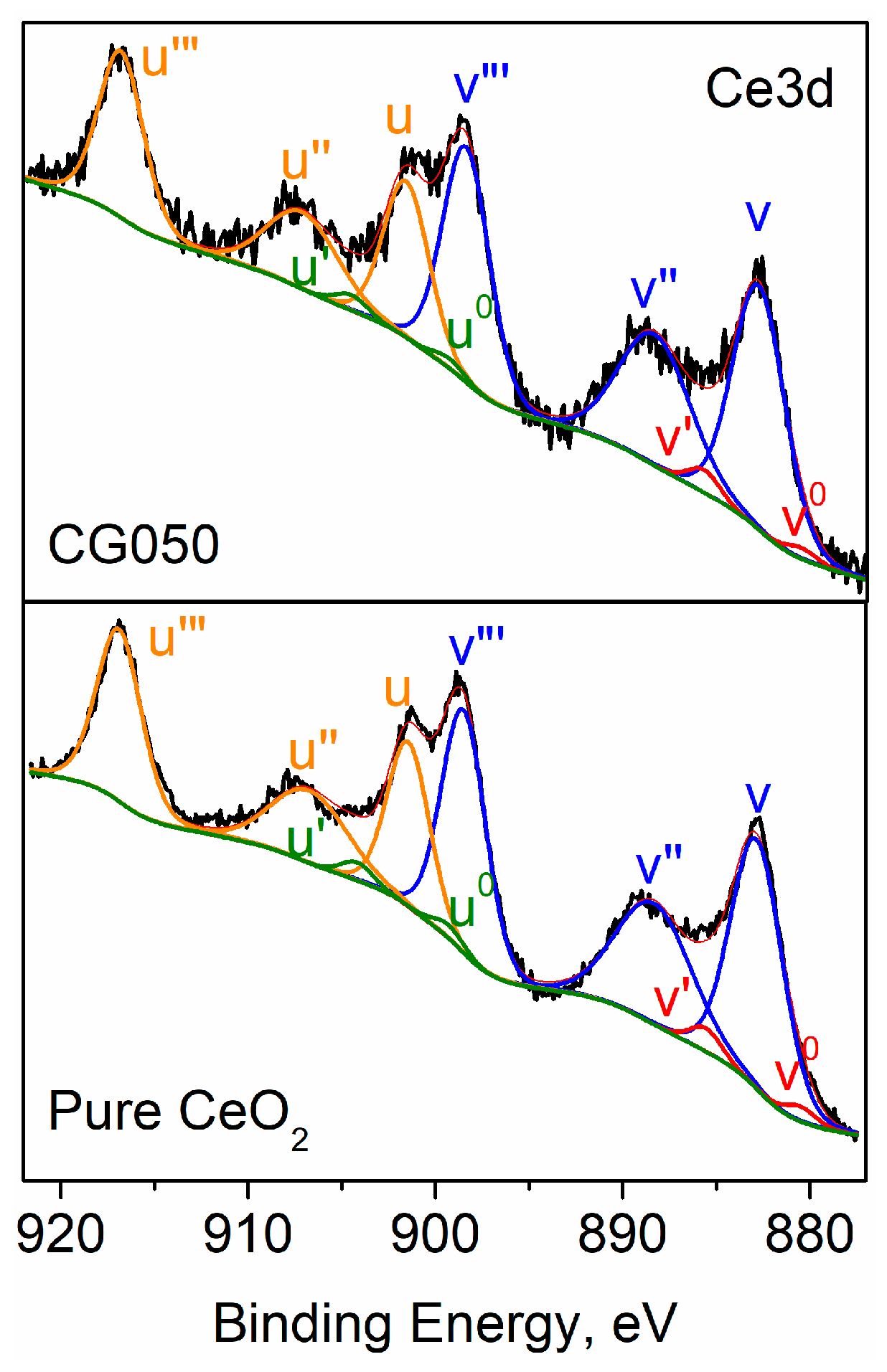 Figure 6. Decomposed photoelectron spectra for pure CeO2 and CGO50.
