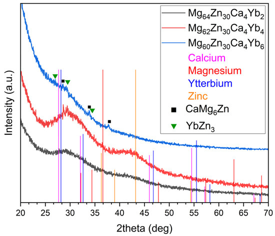XRD patterns of the cast Mg66−xZn30Ca4Ybx (x = 2, 4, 6 at %) alloys.