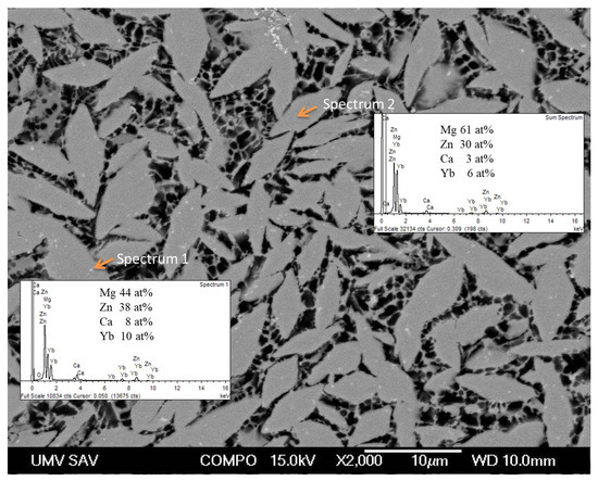 The SEM micrograph of Mg60Zn30Ca4Yb6 (Figure 2) is consistent with XRD results, showing a fine, densely packed arrangement of plate-like intermetallics embedded in a refined Mg–Zn matrix.