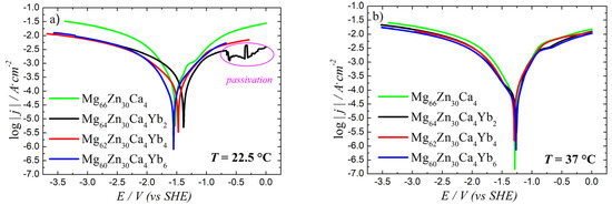 At 22.5 °C, the Mg64Zn30Ca4Yb2 alloy exhibited the highest corrosion current (4.03 mA) and the highest corrosion rate (18.95 mm/y), suggesting the most rapid degradation among the tested compositions. The corrosion potential for this alloy was measured at −1.16 V, while its polarization resistance was 77 Ω. With increasing ytterbium content to 4 at.% (Mg62Zn30Ca4Yb4), a marked reduction in the corrosion current (1.07 mA) and corrosion rate (7.94 mm/y) was observed, along with a more negative corrosion potential of −1.34 V and a slightly higher polarization resistance of 82 Ω. Further increasing the ytterbium content to 6 at.% (Mg60Zn30Ca4Yb6) resulted in the lowest corrosion current (1.01 mA) and the lowest corrosion rate (5.22 mm/y), with a polarization resistance of 83 Ω and a corrosion potential of −1.37 V. The Mg60Zn30Ca4Yb6 sample exhibited passivation behavior at 22.5 °C (Figure 3). These results suggest that increasing ytterbium content generally improves the corrosion resistance of the alloy under room temperature conditions.
