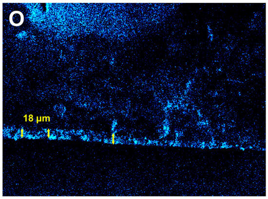 Figure 6 presents the oxygen (O) elemental mapping of the sample’s cross-section. A distinct oxygen-enriched layer with an average thickness of approximately 18 µm is clearly visible near the surface. This continuous oxygen-rich region indicates the formation of a surface oxide layer. The relatively uniform thickness suggests a homogeneous oxidation process across the examined area rather than localized pitting corrosion.