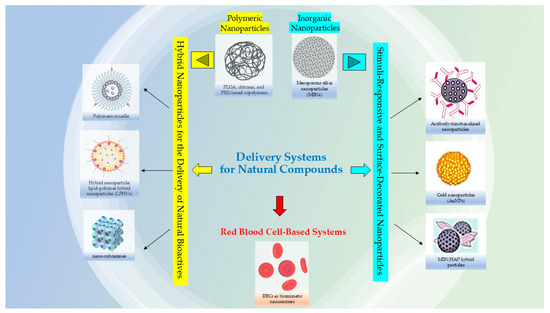 In addition to synthetic nanocarriers, biomimetic platforms such as red blood cell (RBC)-derived vesicles are gaining increasing attention. By exploiting natural membrane components, these systems provide intrinsic biocompatibility, immune evasion, and prolonged circulation, representing a promising complement to polymeric, inorganic, and hybrid formulations for the delivery of natural compounds [22,23].