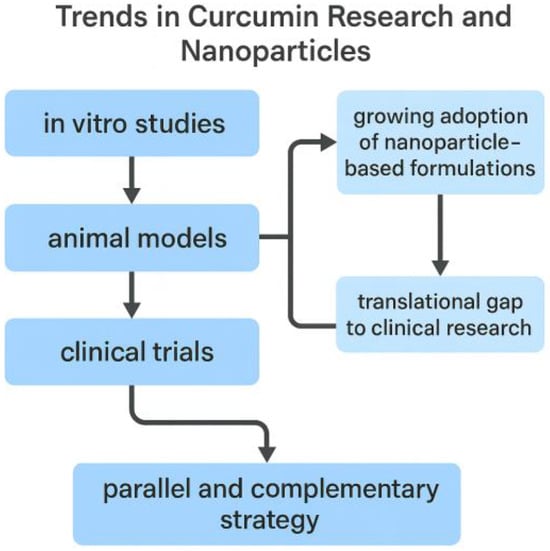 Conceptual overview of publication trends on curcumin research in the biomedical field (2020–2025). The analysis highlights the progressive integration of nanoparticle-based delivery systems across research stages (in vitro, preclinical animal models, and clinical trials), with increasing but still limited clinical translation.