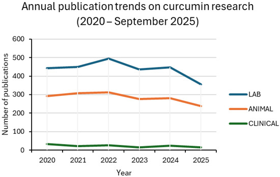 Annual publication trends on curcumin research in the biomedical field (2020 –2025). The line plots show the number of original research articles in three categories: in vitro studies (LAB), preclinical animal studies (ANIMAL), and clinical trials (CLINICAL). Each category includes both conventional and nanocarrier-based studies. Data were retrieved from PubMed using NCBI Entrez E-utilities with the search terms specified in Section 2.