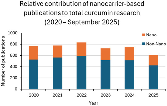 Relative contribution of nanocarrier-based publications to total curcumin research (2020–2025). Stacked bar plots display the proportion of studies explicitly mentioning nanoparticle-related terms (Nano, blue) compared with conventional approaches (Non-Nano, orange). The analysis highlights the greater integration of nanotechnology in preclinical research compared with the clinical setting, where nanoparticle-based trials remain scarce.