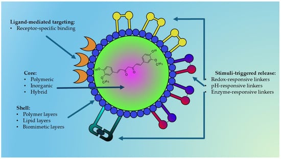 Schematic representation of a nanoparticle designed for the delivery of natural bioactive compounds (e.g., curcumin). The structure consists of an inner core—polymeric, inorganic, or hybrid—selected according to the physicochemical characteristics of the encapsulated compound or extract. The core is surrounded by a polymeric, lipidic, or biomimetic shell that provides structural stability, stealth properties, and biological compatibility. Surface ligands enable active targeting toward specific receptors, while stimulus-responsive linkers mediate controlled drug release triggered by pH variations, intracellular glutathione (GSH), or enzymatic activity. This modular architecture allows fine regulation of pharmacokinetics and site-selective release of natural compounds.