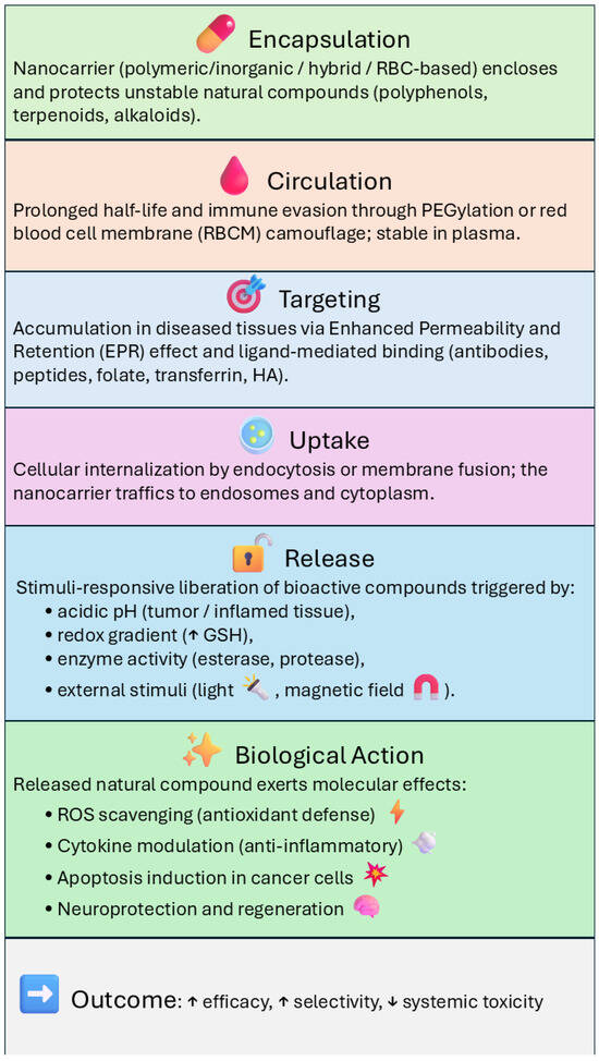 Natural compounds such as polyphenols, flavonoids, and terpenoids have long been explored for their therapeutic potential. They can act as antioxidants, limit inflammation, and influence cancer or neurodegenerative pathways. However, these benefits rarely translate directly into medical practice, as their solubility is poor, chemical stability is fragile, and metabolism is too fast. In recent years, nanotechnology has offered an alternative route. A wide range of materials, polymeric, inorganic, hybrid, or responsive to external stimuli, were designed to protect and deliver such molecules. Each platform features different preparation methods and release behaviors; all intended to extend circulation and increase tissue selectivity. Considerable attention was paid to targeting strategies, both passive and ligand-mediated, that enhance accumulation in diseased tissues. Preclinical studies have confirmed that encapsulation can raise the therapeutic index of phytochemicals against various conditions, including cancer, inflammation, microbial infections, and neurodegeneration. Still, translation to the clinic is far from resolved, limited by uncertainties over safety, manufacturing scale, and regulation. A parallel line of research now investigates biomimetic carriers, including vesicles derived from red blood cells and whole erythrocytes, which offer immune evasion and versatile loading capacity. The convergence of nanotechnology and natural product pharmacology, enriched by such biologically inspired designs, may open the way to more precise, multifunctional, and patient-tailored therapies.