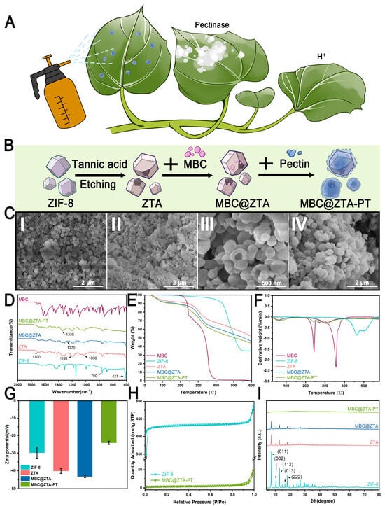 Synthetics and characterization of nanoparticles. (A) Application schematic. (B) Schematic mechanism of the synthesis process for MBC@ZTA-PT nanoparticles. (C) SEM images of ZIF-8 (I), ZTA (II), MBC@ZTA (III), MBC@ZTA-PT (IV). (D) FTIR, (E) TGA, (F) DTG, (G) zeta potential, (H) N2 adsorption–desorption isotherms, and (I) XRD characterization of MBC, ZIF-8, ZTA, MBC@ZTA, and MBC@ZTA-PT.
