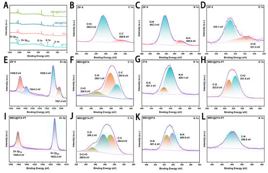 (A) Analyses of ZIF-8, ZTA, MBC@ZTA and MBC@ZTA-PT. (B) C 1s (C) N 1s (D) O 1s and (E) Zn 2p spectra of the ZIF-8. (F) C 1s spectra of the MBC@ZTA, and (G) N 1s spectra of the ZTA. (H) O 1s, (I) Zn 2p, and (J) C 1s spectra of the MBC@ZTA-PT. (K) N 1s spectra of the MBC@ZTA. (L) N 1s spectra of the MBC@ZTA-PT.