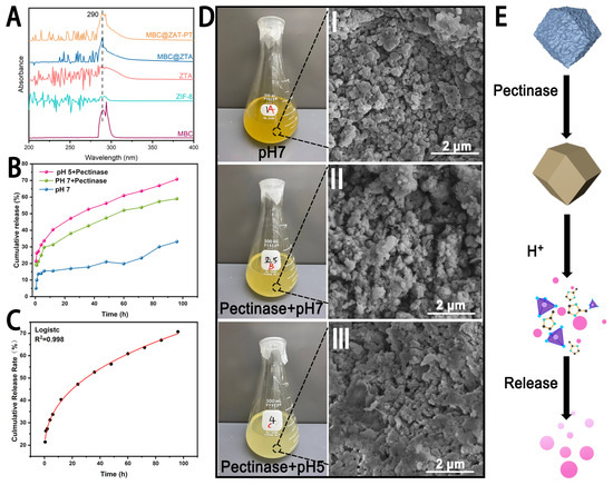 (A) Characteristic Absorption Peaks of MBC (under the same release conditions). (B) Release behavior of MBC@ZTA-PT. (C) Logistic growth model of cumulative release kinetics at pH 5 with pectinase. (D) Solution color and SEM analysis of MBC@ZTA-PT after release under different conditions. (E) Schematic of dual-response drug release mechanism.