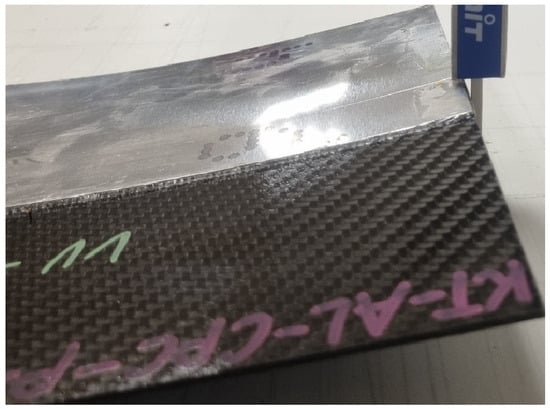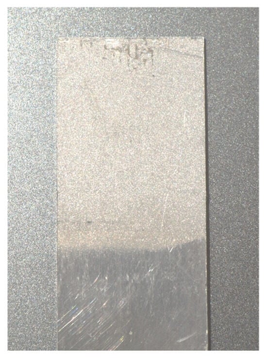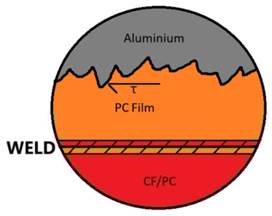 To ensure better joint strength, the surface of the aluminum plate is prepared beforehand (Figure 2). Baker A.A. describes that when controlled micro roughness and a chemically active oxide are used to enhance wetting, promote micromechanical interlocking, and improve durability, the mechanical interlocking of the aluminum with molten polycarbonate introduces an additional shear force component (Figure 3) that increases the shear strength of the joint [25]. Furthermore, the intricate structure of the surface improves durability and moisture resistance, as the complex shape of the joint prolongs the path for water penetration. However, over blasting the aluminum surface traps contaminants and moisture and degrades durability [25]. A corroboration of the surface roughness and adhesion strength relationship is presented in [12], where it is reported that etching of stainless-steel increased surface roughness and raised lap shear strength by up to 32%, with excessive etch time reducing strength due to wire degradation. The review further notes that anodizing aluminum forms a microporous, micro rough oxide that promotes mechanical interlocking with amorphous thermoplastics, improving adhesion relative to smooth metal surfaces. Within [26], a great comparison of surface roughness to adhesion strength is presented, and a value of Ra = 10.18 [µm] can be observed. On the composite side, the bond relies on the thermoplastic nature of polycarbonate. This process, often described as welding, involves heating the polycarbonate to its flow temperature. At this stage, inter-chain bonds become weak, and the polymer flows freely [27], allowing the polycarbonate within the composite and the film to mix thoroughly and penetrate the roughness of the aluminum. As the temperature cools below the glass transition point, the thermoplastic hardens, forming a durable bond. For this experiment the aluminum plate surface was prepared using grit blasting following the guidance presented in [25], and the roughness was judged visually and by feel.