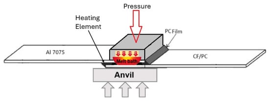 Resistance welding generates localized heat through electrical resistance to melt the material at the interface of a joint. This process follows the principles of Joule heating Q = I2Rt, as current passes through a resistive element placed between the adherends. This heating element can be a metallic mesh, carbon fibres, or a nanocomposite, each chosen based on its specific resistive properties [12]. A metal mesh tends to deliver uniform heating and a wider processing window and was chosen for this experiment. The joint comprises two components, a carbon fibre-reinforced polycarbonate (PC/CF) and aerospace grade aluminum (AL7075). A polycarbonate film is placed between these two components to facilitate the weld. The goal is to generate enough heat to melt the bonding layers and hold this state long enough to allow the PC film to integrate with the PC matrix and penetrate the aluminum surface roughness. Any excess material should be extruded. But the time should be short enough not to heat the whole laminate, and only the bonding layers, otherwise the composite internal structure will degrade. Reducing time by raising the power will result in burning the top layers and oxidizing the fibres [28,29]. For a proper diffusion, pressure application is necessary [30] (Figure 4). The pneumatic actuators apply three bars pressure to the components being joined; maintaining constant pressure is very important and might be challenging due to the thermal expansion of the heated materials, and thus, a feedback-controlled system is recommended. For the best results, the pressure value must eliminate the elastic deformation of the fibre and cause the excess of the polymer film to leak outside the bond. Excessive pressure will lead to a complete film extrusion and additional partial matrix leakage, ending in a dry bond [28,30]. The right combination of thermal energy, time, and pressure ensures quick and effective welding, with the applied pressure allowing for the extrusion of excess molten film and better bonding [12,28].
