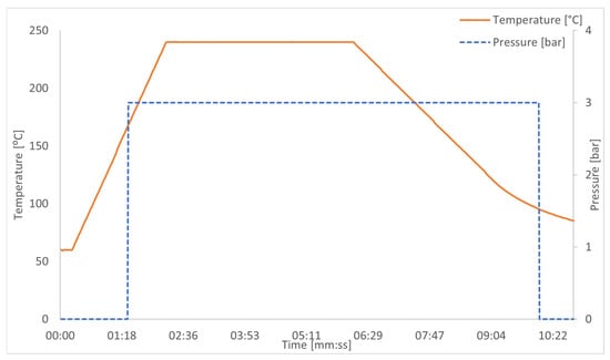 Figure 6. Welding process: temperature [°C], pressure [bar], time [s]. - Welding: During heating, electric current flows through the resistive heating element, quickly heating the surfaces of polycarbonate and aluminum. The high temperature causes the polycarbonate to melt, bonding with the aluminum surface and forming a durable connection [7].