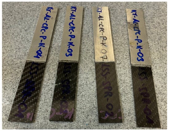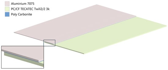 Two panels were joined in a single-lap configuration, a carbon fibre-reinforced polycarbonate laminate (PC/CF) and an aluminum alloy (7075) plate. A 0.2 mm polycarbonate film was used as a welding interlayer. Nominal dimensions of the specimens are summarized in Table 1; material property data and temperature dependencies used later in the FE model are described in Section 5.