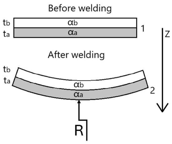 For a welded single-lap PC/CF–Al overlap, the cooled part behaves as a bi-material strip. When this strip is uniformly heated along its entire length, it will bend or deform into an arc of a circle with a radius of curvature, the value of which, is dependent on the geometry and material components making up the strip. This behaviour is the result of a thermal expansion coefficient mismatch. And the subsequent deflection curvature can be estimated using classic Timoshenko, here a Roark’s Formula for Stress and Strain which tabulates engineering forms for thermal curvature and thermal-flexure stress [35] was considered. With these formulas and using the input data presented in Table 2 we can predict the sign and magnitude of curvature κ, the mid-span bow δ, and the membrane stress.