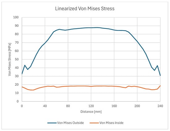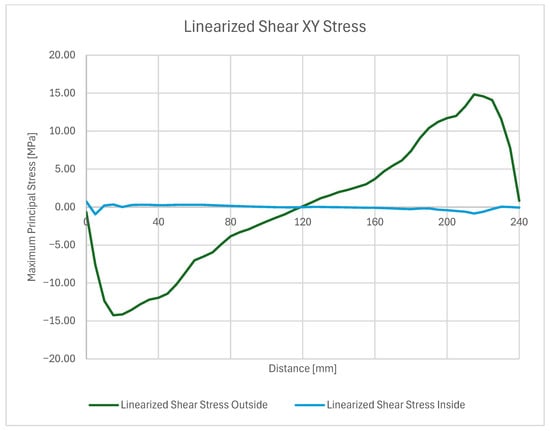 Regarding the highest values of the shear stress at the edge, it must also be noted that the said peak abruptly drops when reaching the inwards of the weld, and when reaching the other edge, rises again, in a different direction; hence, the negative value. A similar phenomenon as with the normal stress is the “peeling” of the bond from the edge, and when the debonding begins, the stress value will translate with it.