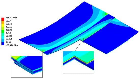 The highest stress is present in the most far-reaching faces from the weld, which is somewhat in the middle. The plates that are being bended create a neutral axis [47] where stress is the lowest.
