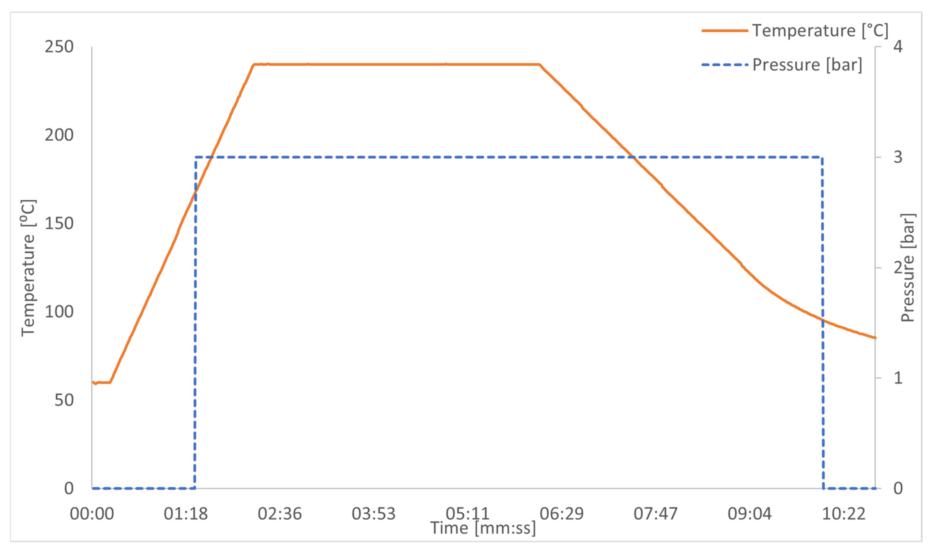 - Setting Welding Parameters: For PC-aluminum joints, it is recommended to set the temperature in the range of 220–260 °C. Exceeding this temperature may lead to polycarbonate degradation, reducing joint strength. Optimal heating time is usually 120–200 s, depending on material thickness and applied pressure, which should be approximately 0.2–0.5 MPa (Figure 6) [7].
