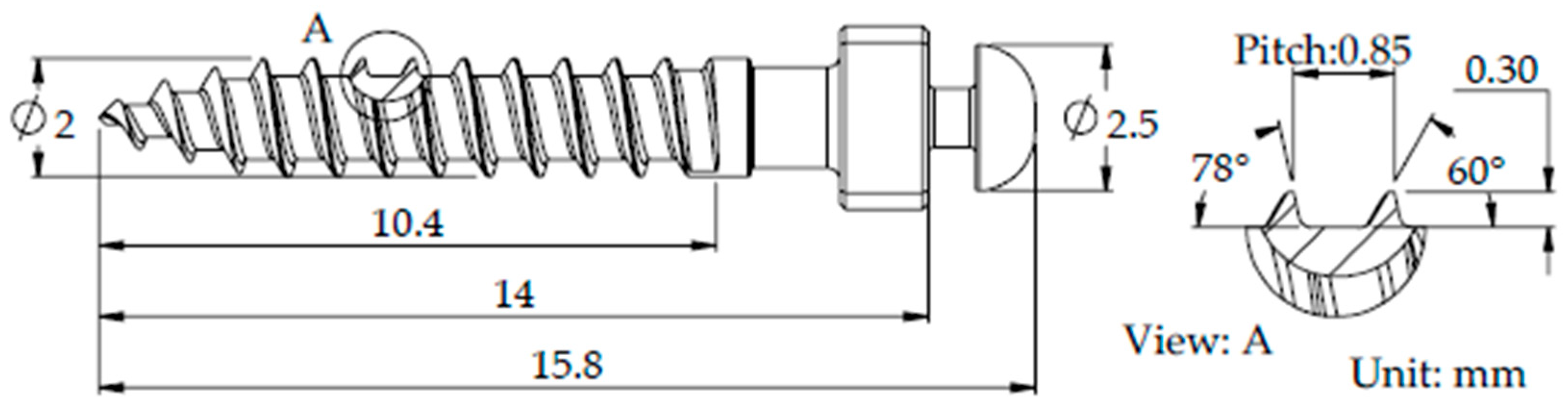 - Do, V.; Hsu, Q.C.; Chen, P.H.; Chen, Y.L. Study on the performance of orthodontic self-drilling correction screw of Ti6Al4V and stainless 316L. Mater. Sci. Forum 2016, 872, 276–280. [Google Scholar] [CrossRef]