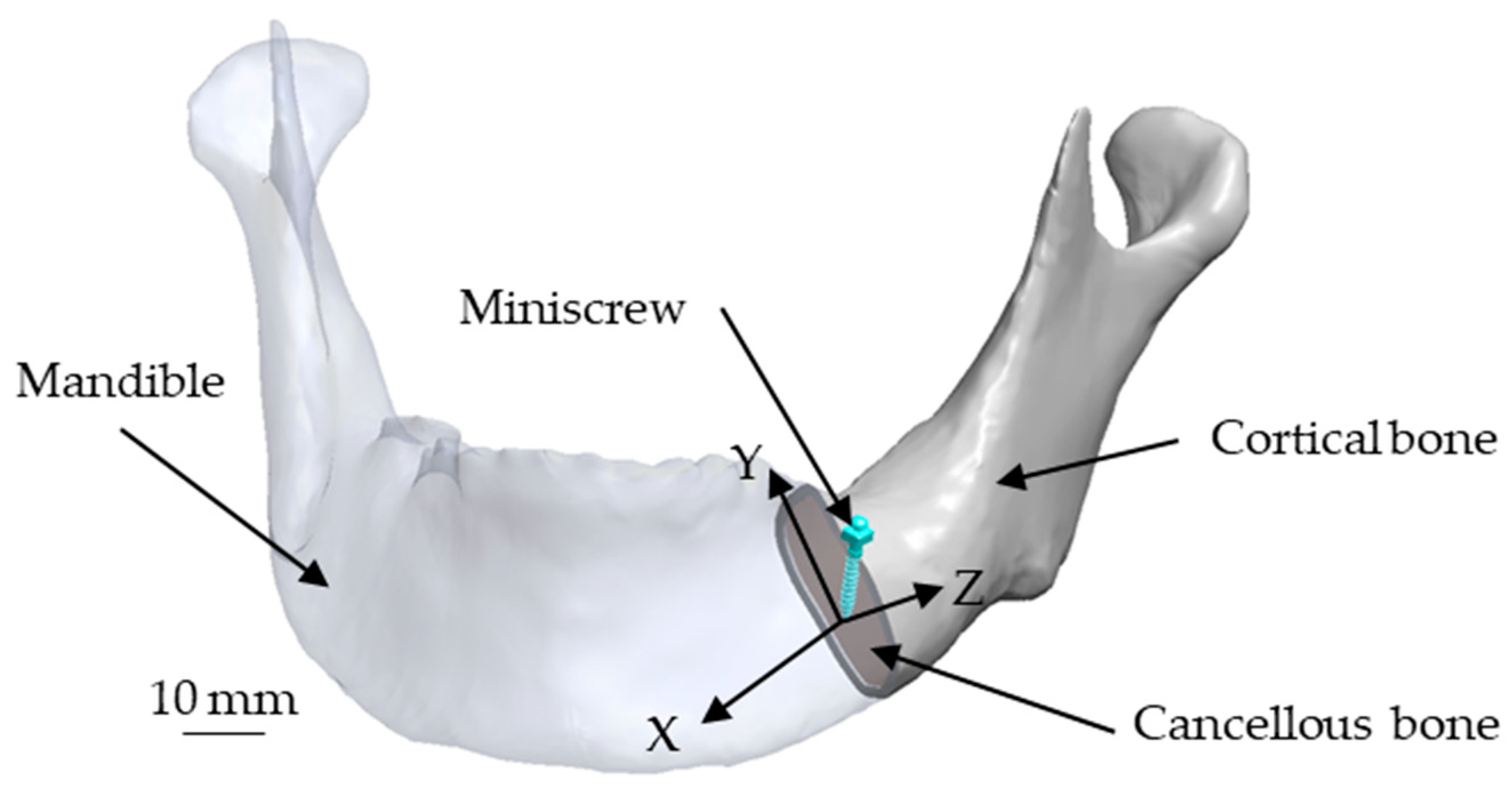 - Duaibis, R.; Kusnoto, B.; Natarajan, R.; Zhao, L.; Evans, C. Factors affecting stresses in cortical bone around miniscrew implants: A three-dimensional finite element study. Angle Orthod. 2012, 82, 875–880. [Google Scholar] [CrossRef] [PubMed]